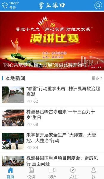 掌上渌口新闻直播客户端拥有海量的新闻资讯和本地的生活服务,软件是株洲县广播电视台打造,为用户带来更多官方资讯,让软件之中的新闻信息更具权威性,喜欢阅读新闻的本地用户快来试试吧!