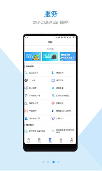 4、将带来的政务服务分类展示,如律师咨询、公益活动、学区查询等;