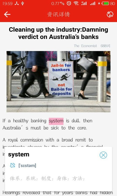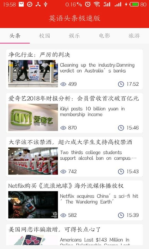 英语头条极速版app是提供阴雨阅读的应用软件,这里拥有大量的英语新闻内容,各种资讯可以随时进行阅读,还可以在线收听文章,播放配音,了解英语含义,边读边听,自由切换中英文,阅读学习十分方便,提升用户的英语阅读体验,值得推荐!