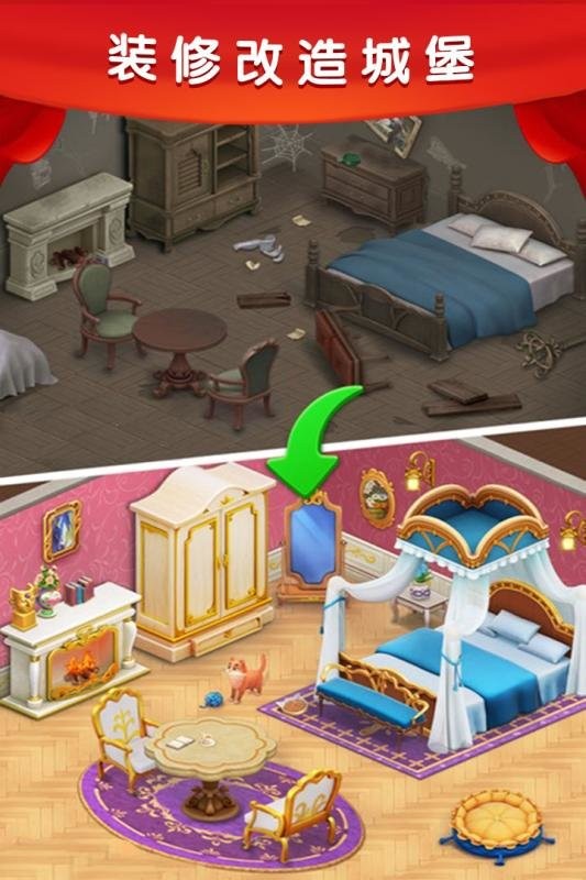 3.一曲动人的传说正等待你来谱写。 完成三消关卡来装饰和修复城堡,变得更加完美