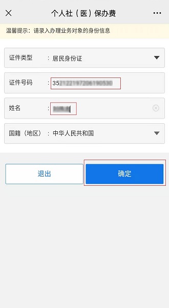 填写身份信息:证件类型(居民身份证);输入证件号码;输入“姓名”,点击“确定”;