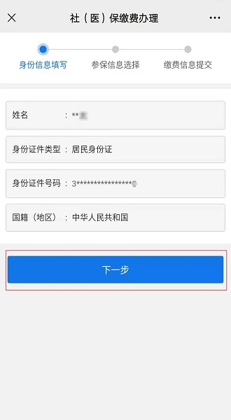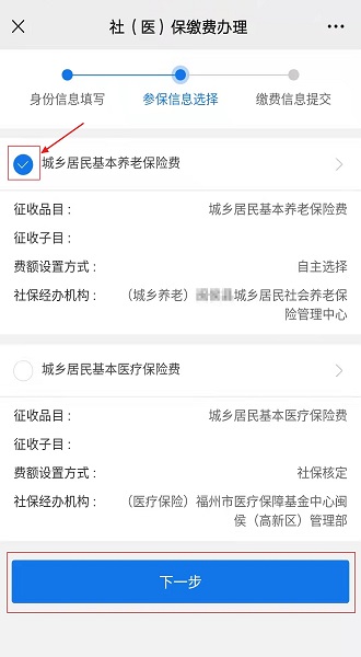 选择参保信息,点击“城乡居民基本养老保险费”或“城乡居民基本医疗保险费”,点击“下一步”按钮;