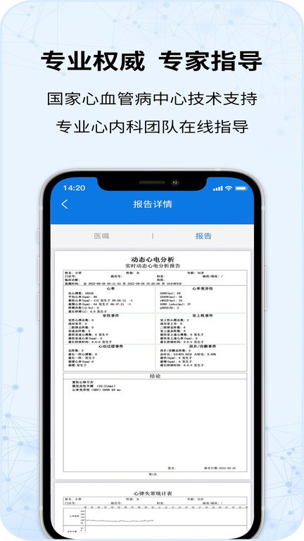 拥有两种不同心电报告数据栏目,该页面同时提供心电数据和心电报告栏目;