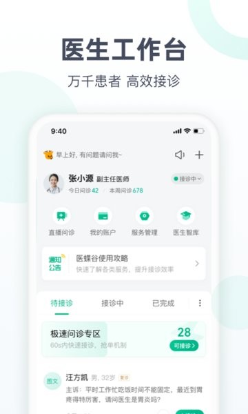 医生可在系统中设置的指定时段内,通过图文、电话以及语音等方式,为更多的患者提供专业医学咨询服务。其中专家图文问诊和电话问诊可自主定价;极速问诊服务由平台统一定价,定向结算。