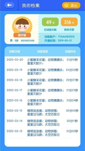 3、用户在个人详情界面可以查看自己每天的视觉训练记录,包括训练时长和训练项目