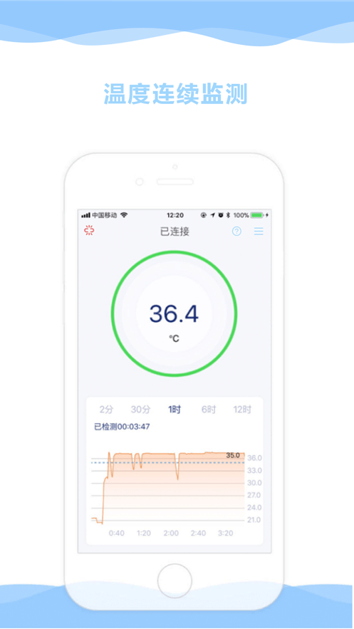 支持连续体温监测,24小时监测宝宝的体温状况,连续、清晰、准确、测温数据高度精准,误差控制在 ± 0.1°c区间内,绘制温度曲线,温度趋势一目了然。