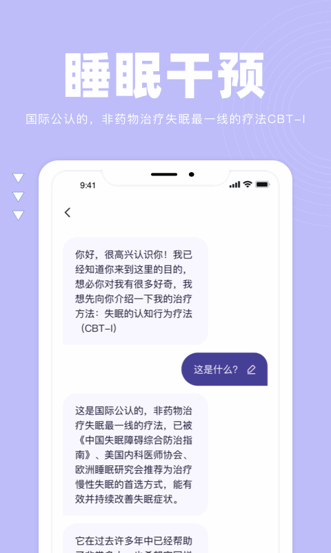 如眠是一款用于治疗慢性失眠的数字疗法软件,依据失眠的认知行为疗法(CBT-I)研发,以模拟现实中面对面的CBT-I治疗方式来实现治疗。CBT-I的科学性已经广泛被认可,已被《中国失眠障碍综合防治指南》、美国内科医师协会、欧洲睡眠研究会推荐为治疗慢性失眠的首选方式,能有效并持续改善失眠症状。本软件适用于18周岁及以上慢性失眠患者的治疗。