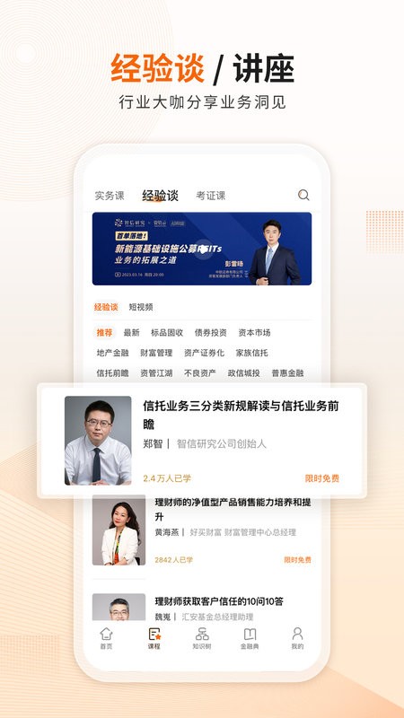 课程体系覆盖市场、行业、投行、资管、财富五大板块的方方面面。