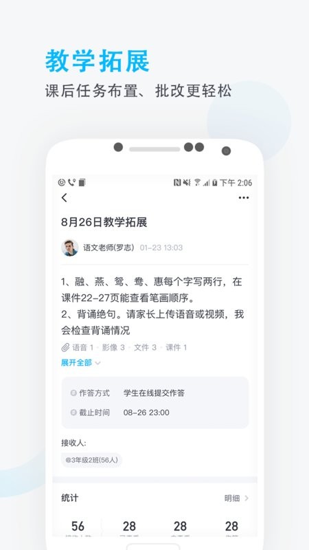 一键发布班级通知和学习任务,实时查看家长接收反馈,还有免费短信提醒查看;