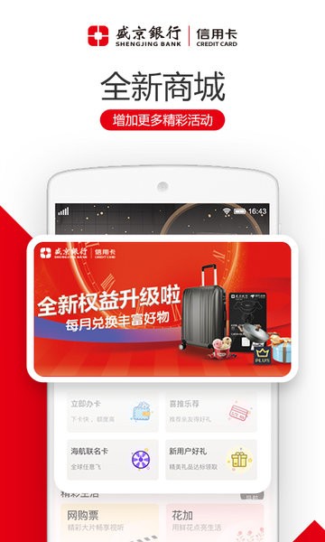 首页呈现精选营销活动展示、提供热门活动的快捷入口,多种惊喜卡权益,线下特惠商户享消费满减优惠,让您及时方便了解盛京银行信用卡优惠信息。