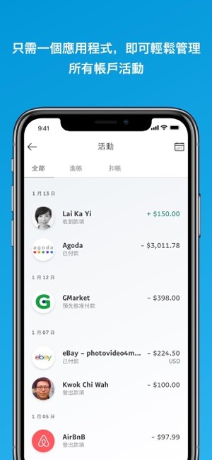 流动应用程式体验现在更加完善,让你轻松向朋友和家人付款和要求付款、检视你的帐户活动、选择所需货币以付款到全球各地等。从此,你毋须再苦恼如何为周末小旅行或昨晚的晚餐还款给朋友。