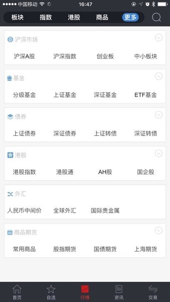 沪深市场、自选股、创业板、涨跌排名、资讯、港股通、掌厅、登录判断、消息中心。