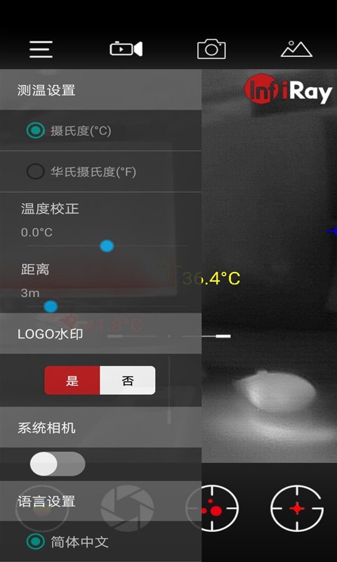 艾睿天眼app作为艾睿天眼t2热成像仪配套软件,与热成像仪配合使用能够在手机上查看实时的热成像效果图,温度变化看得见,非常之智能,支持放大缩小和进行移动,可以进行温度校正、能够设置距离参数。