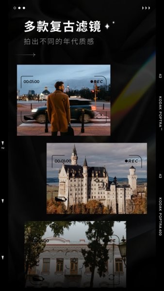 Dazz相机是一个可以设置日期戳的拍立得,它能让你美丽的照片和视频看起来具有模拟胶片的珍贵复古感。那是90年代最流行的复古相机。这个应用程序不仅有流行胶片滤镜还有特效镜头,胶片亭,宝丽来相机,漏光,灰尘,颗粒过滤器的效果。