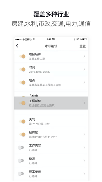 5、内置自动保存工程项目,工程单位名称等功能,自动获取地点,经纬度和时间,让您快速拍摄工程照片