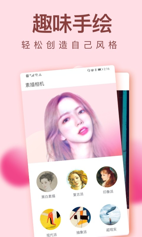 小猪素描相机里面有丰富的艺术相机的分类,包括黑白素描、复古派、印象派、现代派、抽象派、超现实等各类的艺术相机的分类,能给用户不用的艺术流派的艺术体验,让您的照片制作出来即是一副艺术作品!