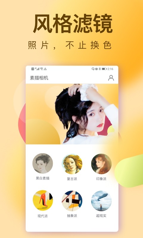 小猪素描相机里的各种相机效果都非常棒!是我们自主研发的智能算法,对于不同艺术流派的艺术效果进行模仿,可以达到惟妙惟肖的效果,用户随手一拍即为绘画大师的感觉!