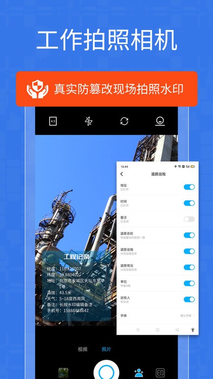 经纬位置打卡相机是一款支持经纬度位置定位的工作拍照相机。用打卡相机的照片无法作假,时间、地点、备注无法修改;是物业公司、工程公司、装修公司、物流公司、互联网公司、有关机构等的必备的工作拍照水印相机。