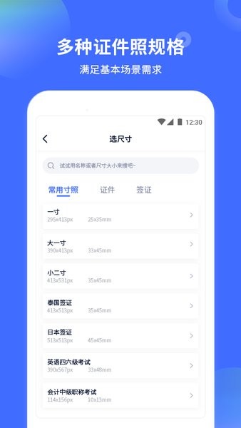 软件中尺寸规格齐全,一寸照、二寸照、各种考试证件照、旅游签证证件照、工作证件照等等覆盖工作学习中的各类证件照的使用场景,我们都能满足