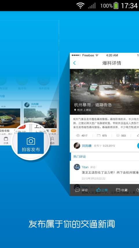 交通拍客是由浙江车联网络文化有限公司研发推出的一款交通参与自媒体社交平台。不论是上班族还是学生党,在交通生活中,都会有令你感动或愤怒的现象,拥有《交通拍客》,你只需动动手指拍摄下来,附上自己的观点并上传,你就会获得积分的奖励,从而享受我们为您提供的线下汽车服务。在这里,你是交通生活的参与者,也是交通现象的评论者;在这里,会让你结识到更多志同道合的“车友”,让你有意想不到的收获。