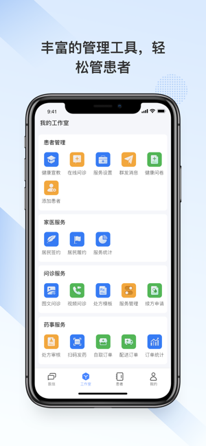 健康宣教、在线问诊、服务设置。群发消息、健康问卷、添加患者