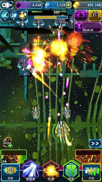 3、升级你的炮火让射击变得更加智能和轻松,在浩渺的宇宙空间里操纵高科技智慧凝结的战斗机和宇宙敌人作战,快来体验吧!