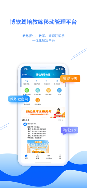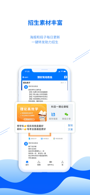 博软驾培教练致力于驾校及教练提供招生工具,提高教学能力和服务水平;教练入驻了驾校教练通,可随时定制招生活动,分享招生海报,分享的海报,自带驾校招生小程序,发展自己招生渠道;实时更新好的招生段子和海报内容,是驾校教练招生必不可少的好武器!