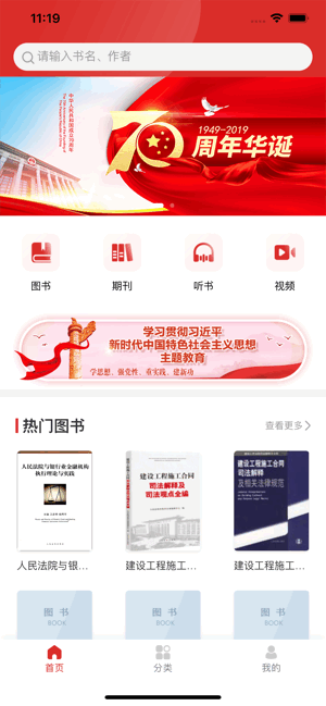 数字图书馆App拥有十万余种图书资源,涵盖社科、科技、教育、历史、少儿、古籍、外文等多个领域,满足您多样化的阅读需求。其中,法律类图书包括中外文法律专业类、社科类图书4万余册;“茅盾文学奖”“鲁迅文学奖”“五个一工程”奖获奖图书、畅销图书和名家名作超过3000种;“学习党史 学习四史”板块涵盖党史、新中国史、改革开放史、社会主义发展史图书合计479本,让您原原本本地读、学、思、悟,深刻领悟“两个确立”的决定性意义,增强“四个意识”,坚定“四个自信”,坚决做到“两个维护”,切实做到理论上清醒和政治上坚定。您可以在线浏览图书封面、目录、简介等信息,随时随地开始您的阅读之旅。