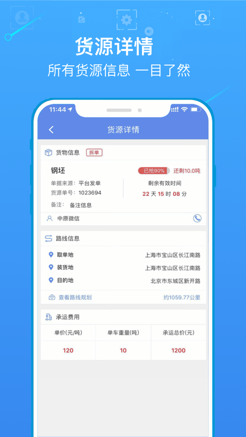 查看货源详情,包括重量、单价、数量、取单地、取货地等信息。
