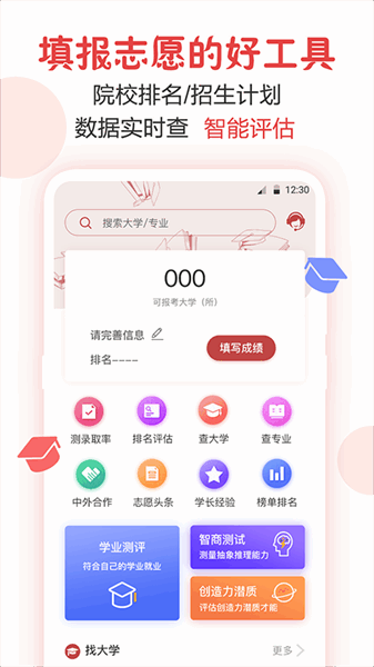 综合专业测评结果、考分、排名,与分数预测模型,基于人工智能算法实现智能志愿推荐,使考生进入最好的大学,学最适合自己的专业
