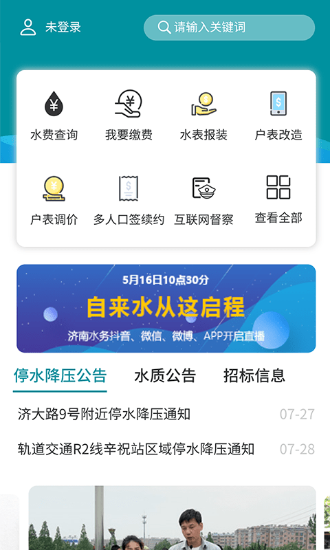 济南水务app最新版可以在手机上查水费和进行费用的缴纳,支持在线进行水表报装和户表的改造,能查看最新的停水通告,及时做好储水的安排,可以查看缴费网点的发分布图,能查看详细的用水量统计图,还可以学习水务相关的知识。