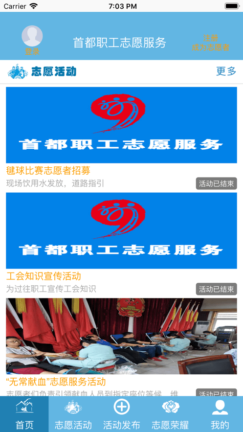 首都职工志愿服务app为职工提供了一站式的志愿服务,有最新的志愿者活动和招募信息,支持在手机上注册成为志愿者,可以加入队伍开展志愿活动,用户可以在线发布活动和参与活动,能查看精彩的志愿活动相册。
