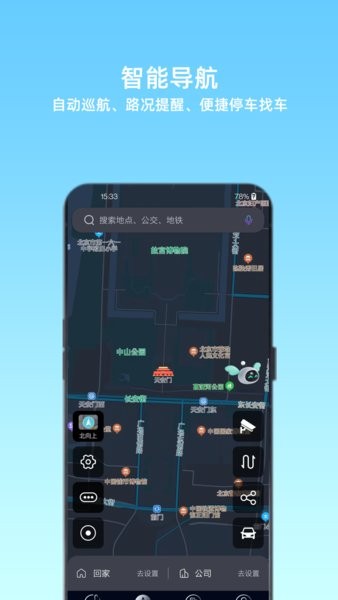 停车找车,自动巡航,路径规划:路况、违章、美食、商城、酒店、休闲娱乐、维修站、停车场等优选导航信息,为您提供快捷导航服务,让您精彩随行。