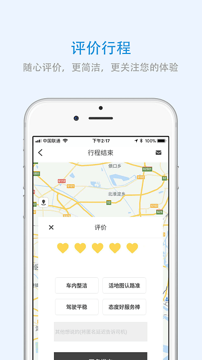 2、行程评价,自己到达目的地之后能够对这次的订单进行自主的评价;