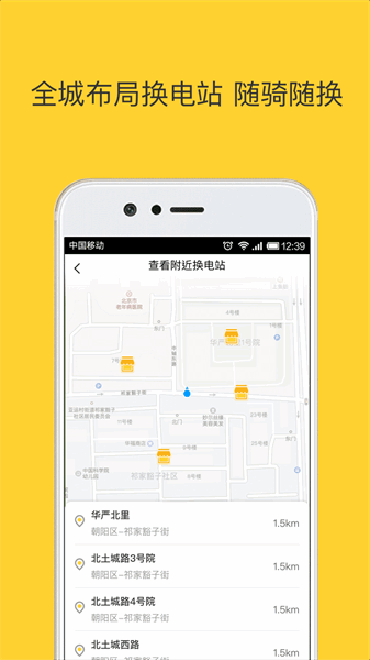 1、扫码骑车,一键扫车,立即骑车