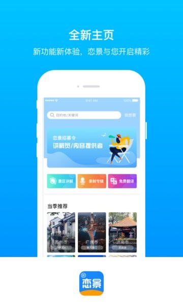 新恋景旅游是可以帮助用户带来景区讲解的旅游平台,所有的景点都可以在软件之中寻找景点解说,让用户进入景点再也不会摸不着头脑,海量的金牌讲解随时都可以收听。