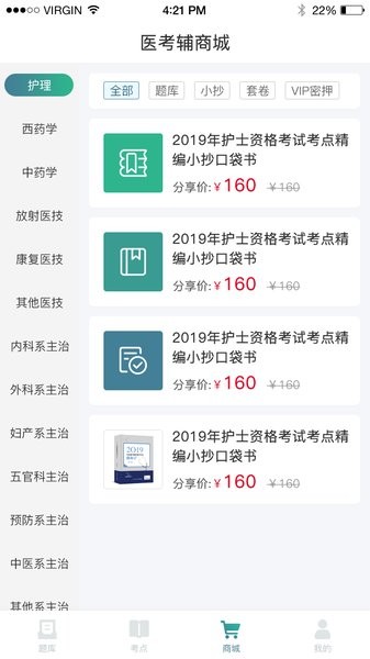 易考辅是一款专为医学行业的伙伴辅助学习的软件,包含了卫生资格,护士资格,执业医师,执业药师,大型设备上岗证等考试题库,可以随时进行训练、口袋书、视频讲解等相关内容的了解,可以选择不同专业方向学习哦!