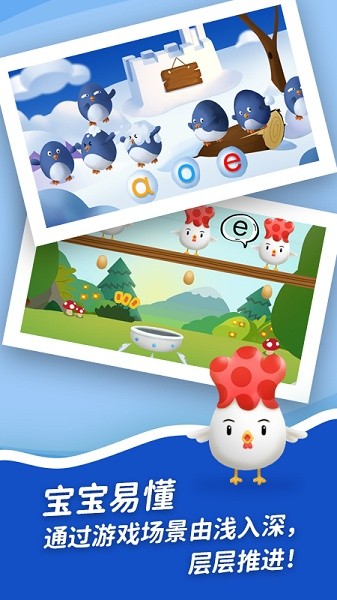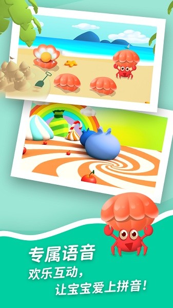多种游戏场景,这里设计了不同的游戏场景便于孩子从易到难的学习汉语拼音;