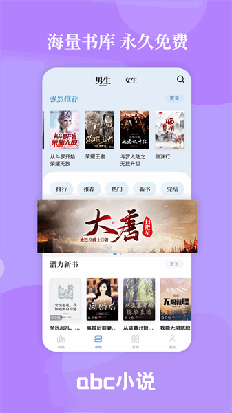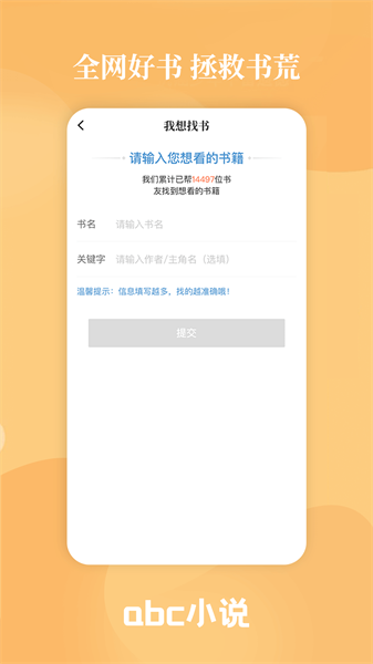 abc小说app免费版是非常好用的一款能够帮助用户们找到超多种类小说的手机平台,软件上有非常齐全的小说种类让用户们来寻找,各种各样的小说种类在这里全都能够找到,帮助用户们快速找到自己想要的看的小说,超级的好用。