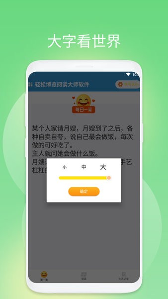 轻松博览阅读大师,通过大字体的设计,缓解用户阅读时的眼部疲劳。放大字体,畅享阅读过程。满足中老年人休闲娱乐的需求,让世界变清晰,让世界更美好!
