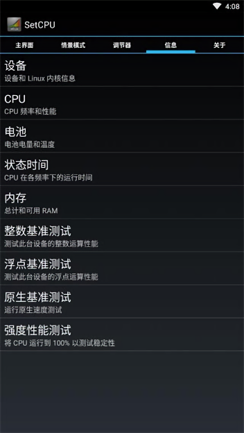 非常出色的CPU辅助工具,能够有效的进行CPU的调节,为用户详细的展示CPU的详细信息,同时setcpu还能够进行十分精准的频率调节,让你更加精准的控制手机。避免因为电压过高/过低导致系统不稳定(需要系统内核支持)!