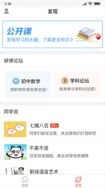 i同学是一款服务于在校大学生用户的掌上校园app应用。可以在手机上完成学习任务和研修活动。随时查看自己的学习成绩。作业、成绩、通知公告、简报等各种通知即时查看。选择自己喜欢的公开课,在公开课圈子里和大家讨论学习。