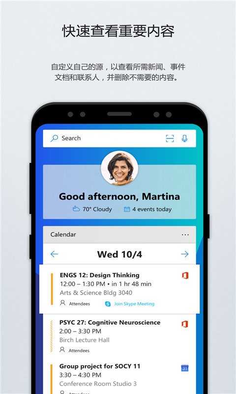 在个性化源中快速查看最重要的信息,如新闻、日历事件、文档和联系人等。甚至还可将源设置为默认主页。