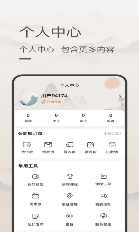 在弘道者app中,展示用户基本信息,关注的人和被专注的人。在鸿商城里边购买的书籍订单的请款,我的课程,展示首页购买的课程,方便查找,地址管理,购买书籍时收获地址的管理,优惠券,领取的平台优惠券,可用作购买课程和鸿商城内购买书籍使用。我发布的,在学习圈里边发布的文章都会展示在这里。设置,设置一些基本信息。