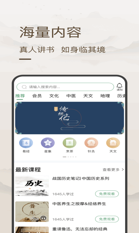弘道者手机版是一款提供传统文化知识内容教育学习的应用软件,致在弘扬民族传统文化。这里有着文化、中医、天文、地理、历史等不同类别知识,还有易经、星象、烹茶、针灸等内容,丰富又全面,不同的课程可以在线学习,免费观看,帮助大家掌握更多中国传统文化!