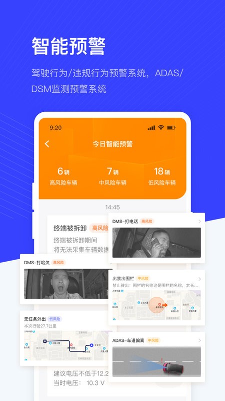 智能预警,驾驶行为预警系统、违规行为预警系统、adas行车预警系统、dsm驾驶人监测系统。