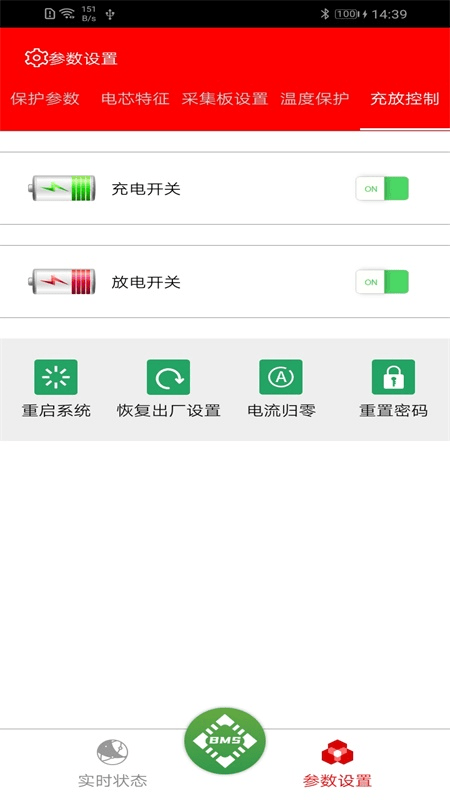⑤在充放控制界面,可以对充放电MOS管进行开关,还可以重置下设置密码