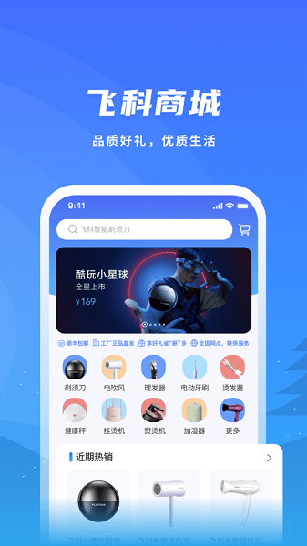 飞科智能软件还支持查看空气指数,知道室内外的空气质量,还可以预约净化空气的时间,挺方便的。商城里有很多高品质的电器,比如吹风机、剃须刀这些个人护理产品,还有智能家居设备,选择挺多的。