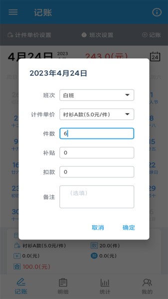 2、点击【记账】,选择班次、计件单价、件数、补贴、扣款等信息