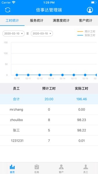 倍事达管理平台端适合管理人员来使用,能够查看员工的详细工时,包括预计工时和实际工时,以列表的形式展现,非常清晰,能查看详细的服务、客户以及满意度统计,员工绩效一目了然,支持查看订单的实时进度,可以在线新增员工信息,管理更方便!